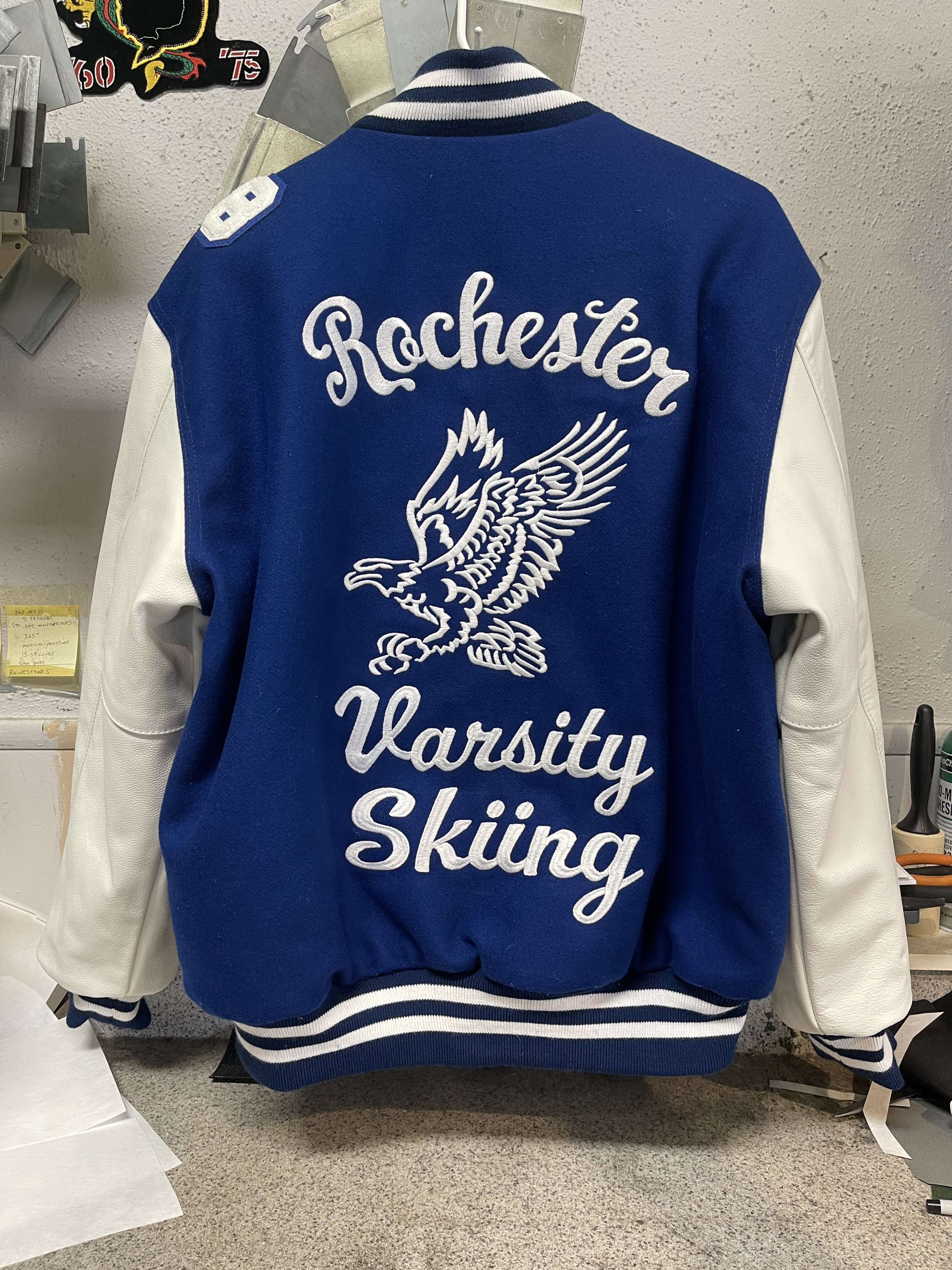 WORK OF ART COATS BY AVALON SKIES JACKET ARTIST. high school with custom picture and 3 patches each sleeve is $1,900 on average. fraternity jackets $2,500 on average.