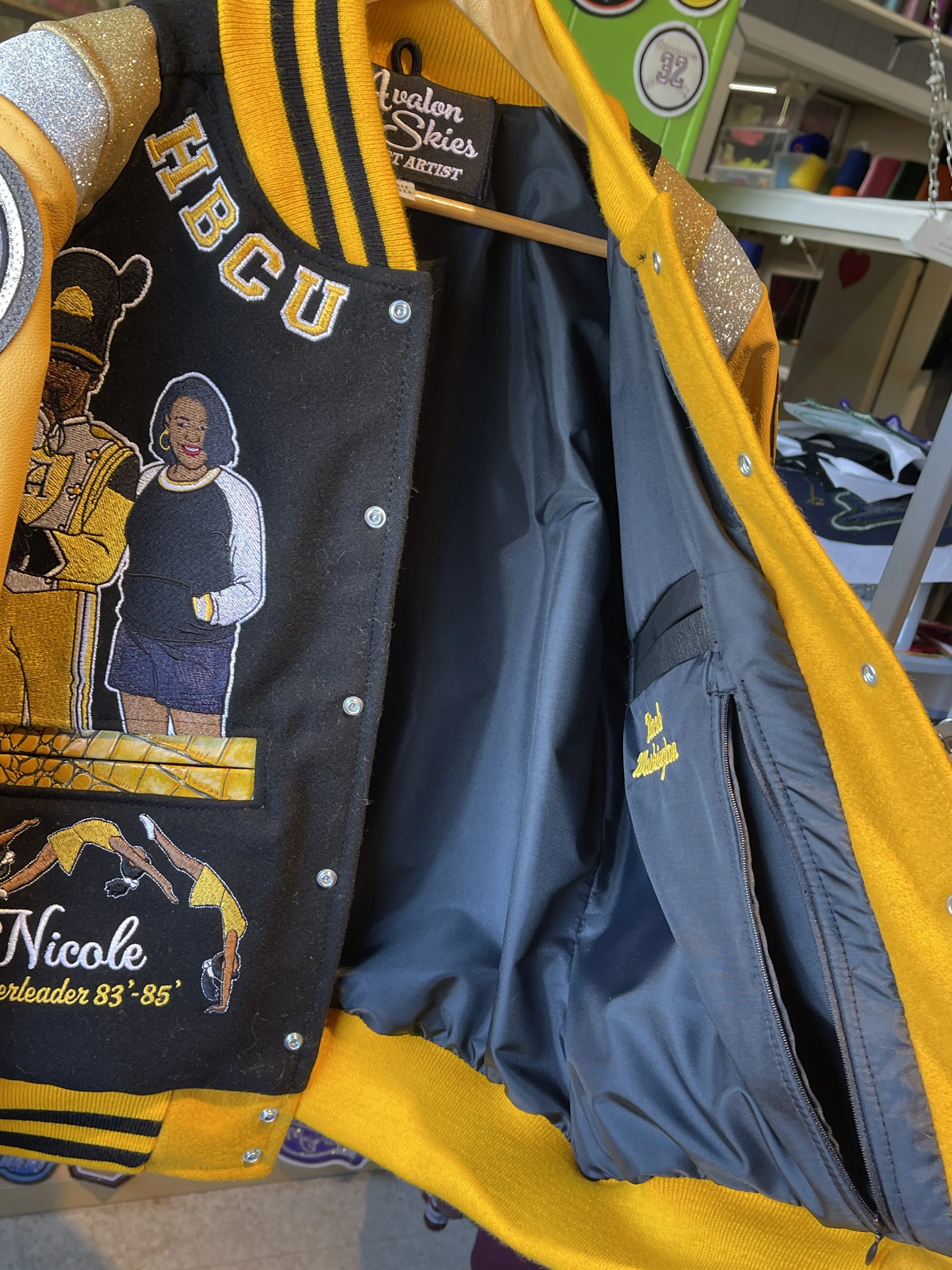 Avalon Skies Jacket Artist, manufactures elaborate custom varsity jackets from scratch In-house.